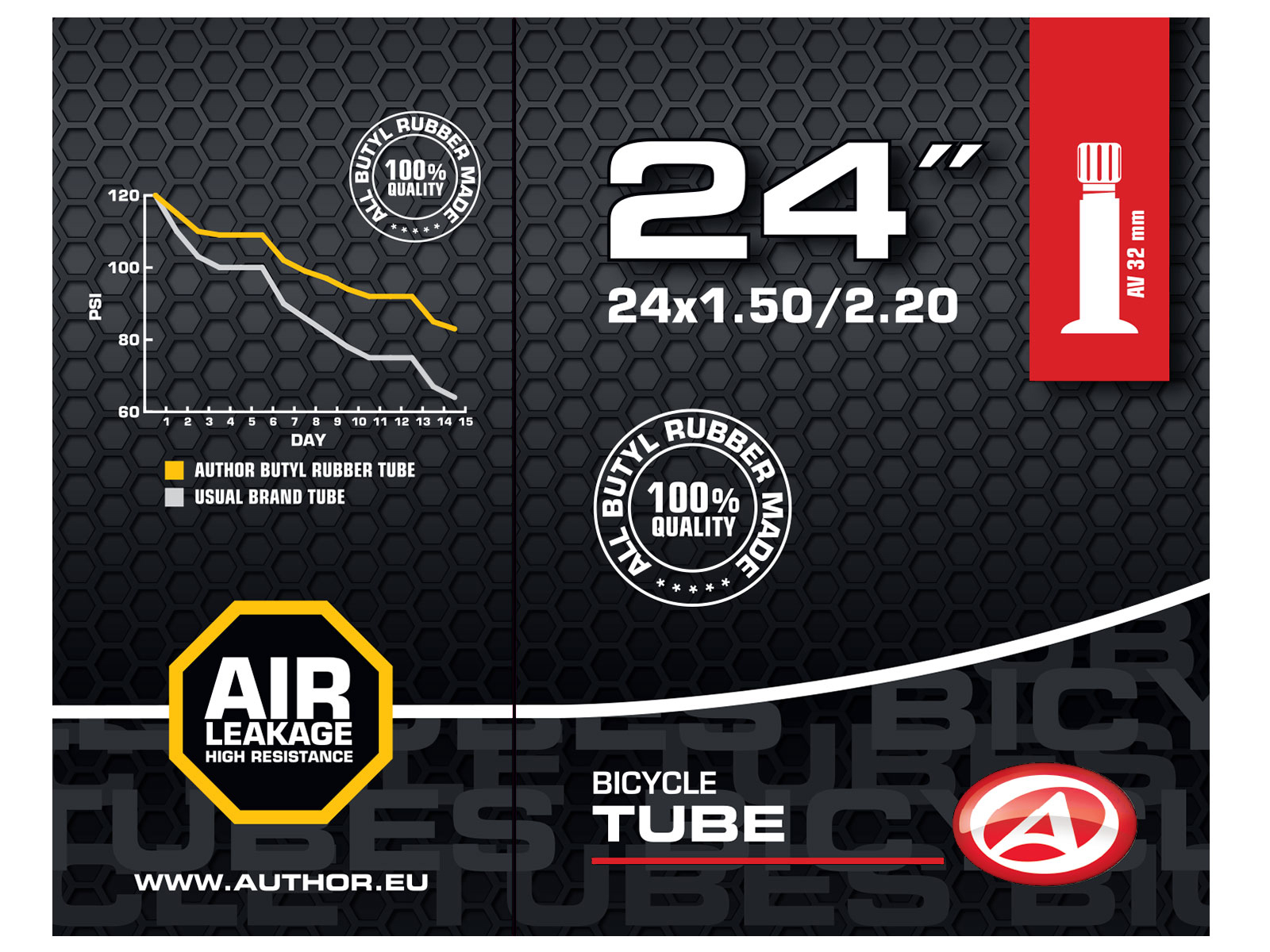 Duše AUTHOR 24x1.50-2.20 vyrobená ze 100% butylové pryže s velmi nízkou propustností pro plyny. Udrží tlak vzduchu v pneumatice jízdního kola po delší dobu, než duše vyrobené ze syntetické pryže.