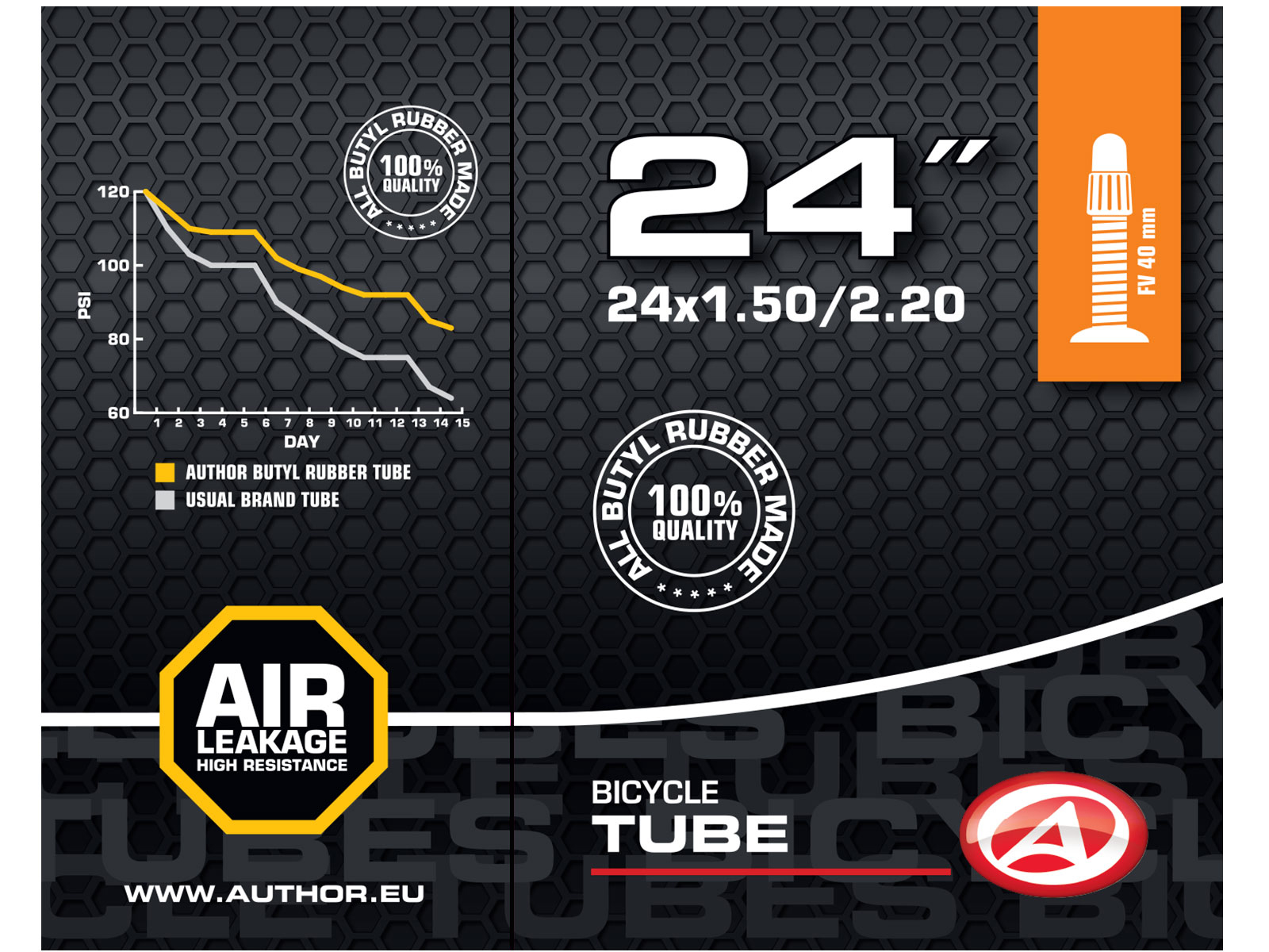 Duše AUTHOR 24x1.50-2.20 vyrobená ze 100% butylové pryže s velmi nízkou propustností pro plyny. Udrží tlak vzduchu v pneumatice jízdního kola po delší dobu, než duše vyrobené ze syntetické pryže.