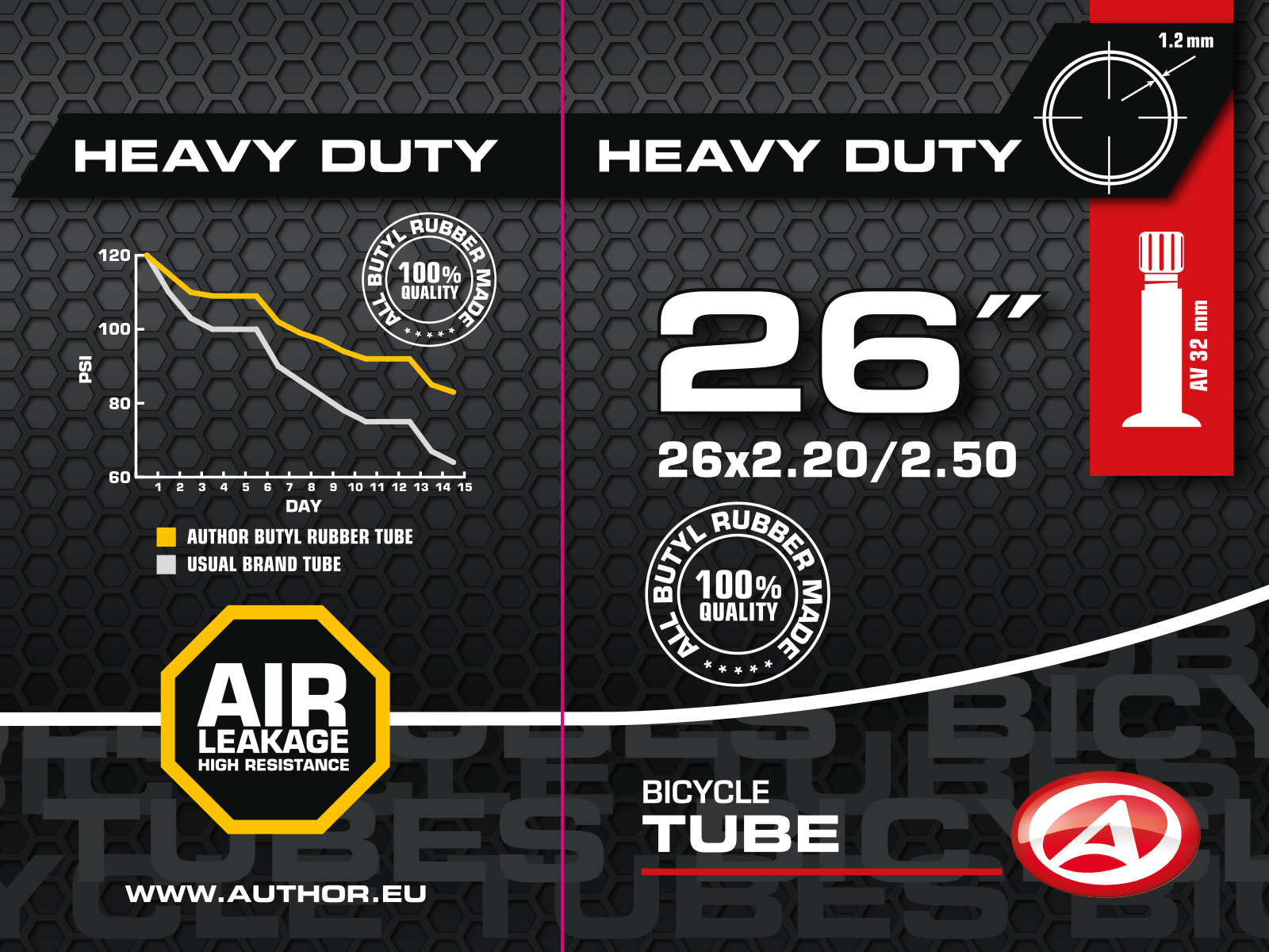 Duše AUTHOR 26x2,20-2,50 vyrobená ze 100% butylové pryže s velmi nízkou propustností pro plyny. Udrží tlak vzduchu v pneumatice jízdního kola po delší dobu, než duše vyrobené ze syntetické pryže.Auto ventil 32 mm.