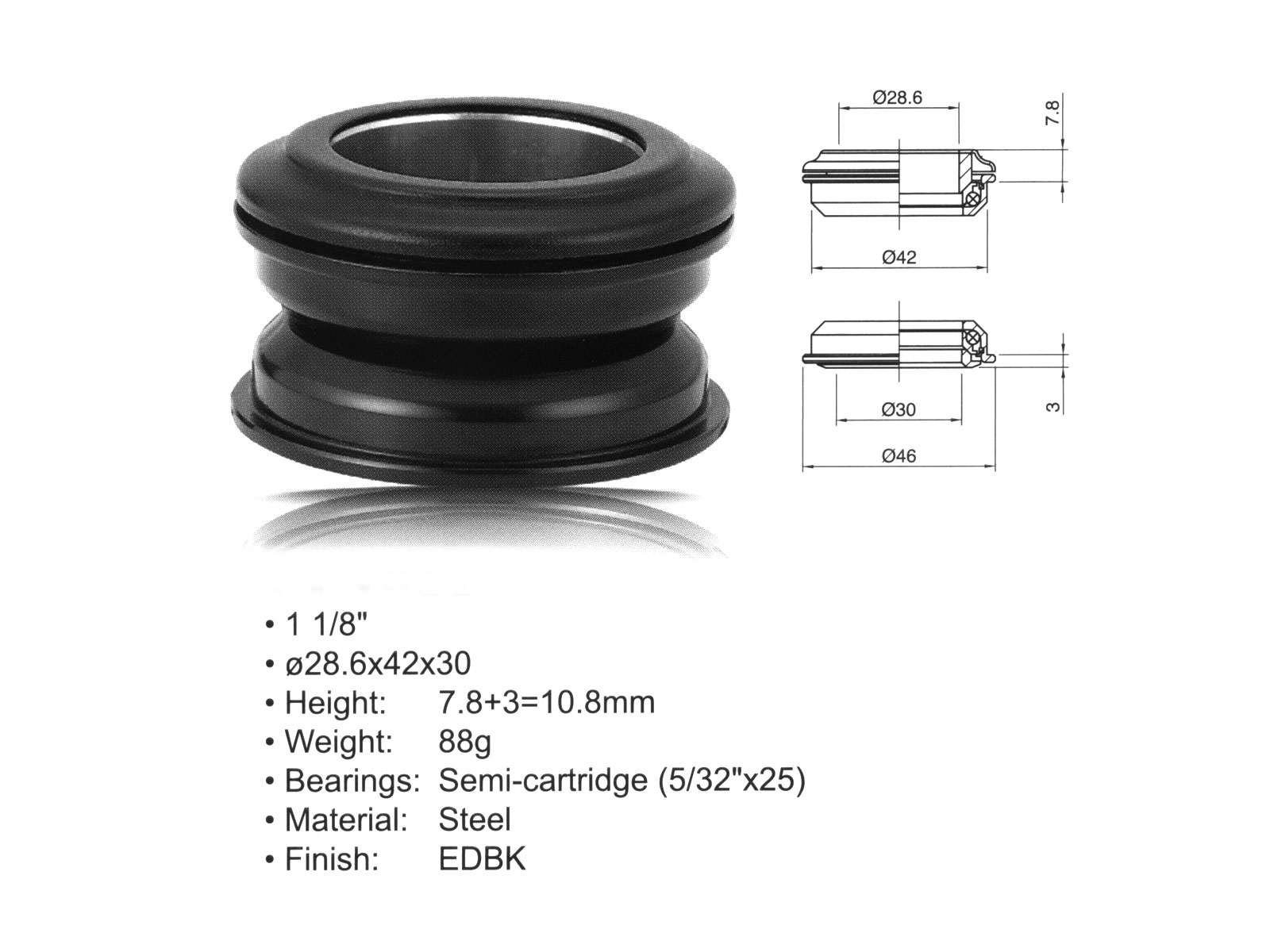 * 1 1/8"; d. 28.6x42x30; H:15,6+3=18,6mm;* Materiál:ocel* kuličkové ložisko (5/32"x25)