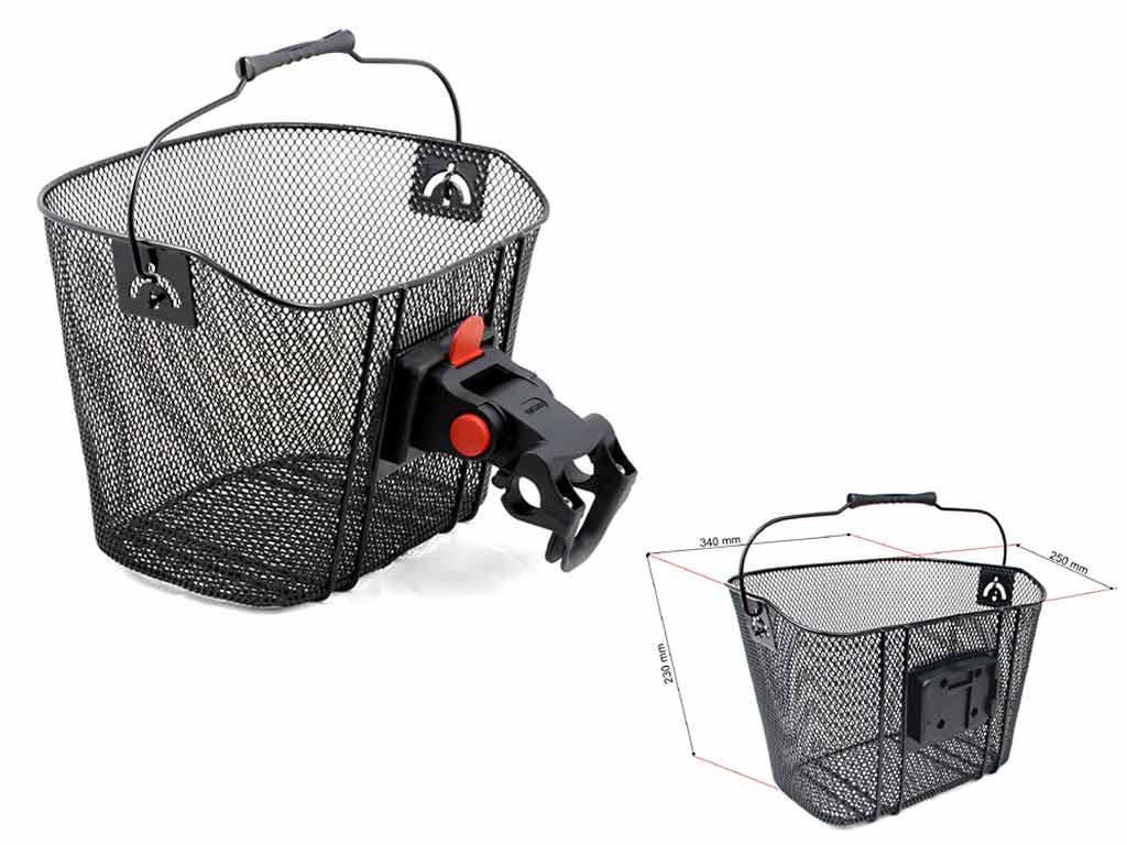 Košík na řídítka, jednoduchá montáž držáku QRB na průměr řídítek 25,4 nebo 31,8mm, nastavitelný úhel sklonu, včetně držáku QRB, nosnost max. 5kg, samostatný držák = položka #15 003 904. Tento koš vyžaduje odbornou montáž.