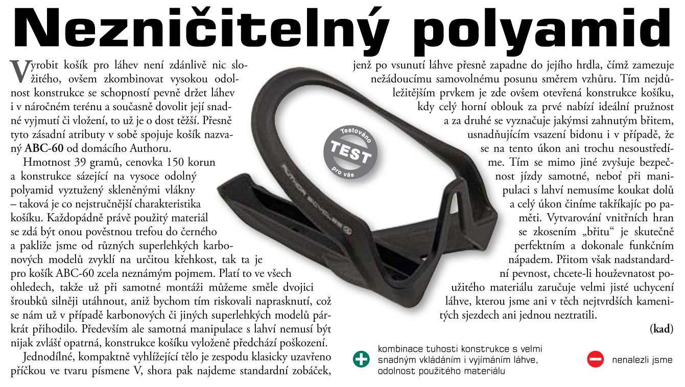 AUTHOR ABC-60 je jednodílný košík na láhev vyrobený z odolného polyamidu vyztuženého skleněnými vlákny se stylovým lesklým povrchem. Je velmi lehký a má tvarované vnitřní hrany, které usnadňují vložení a vyjmutí láhve. Díky otevřené konstrukci je vhodný pro všechny velikosti cyklistických lahví.
