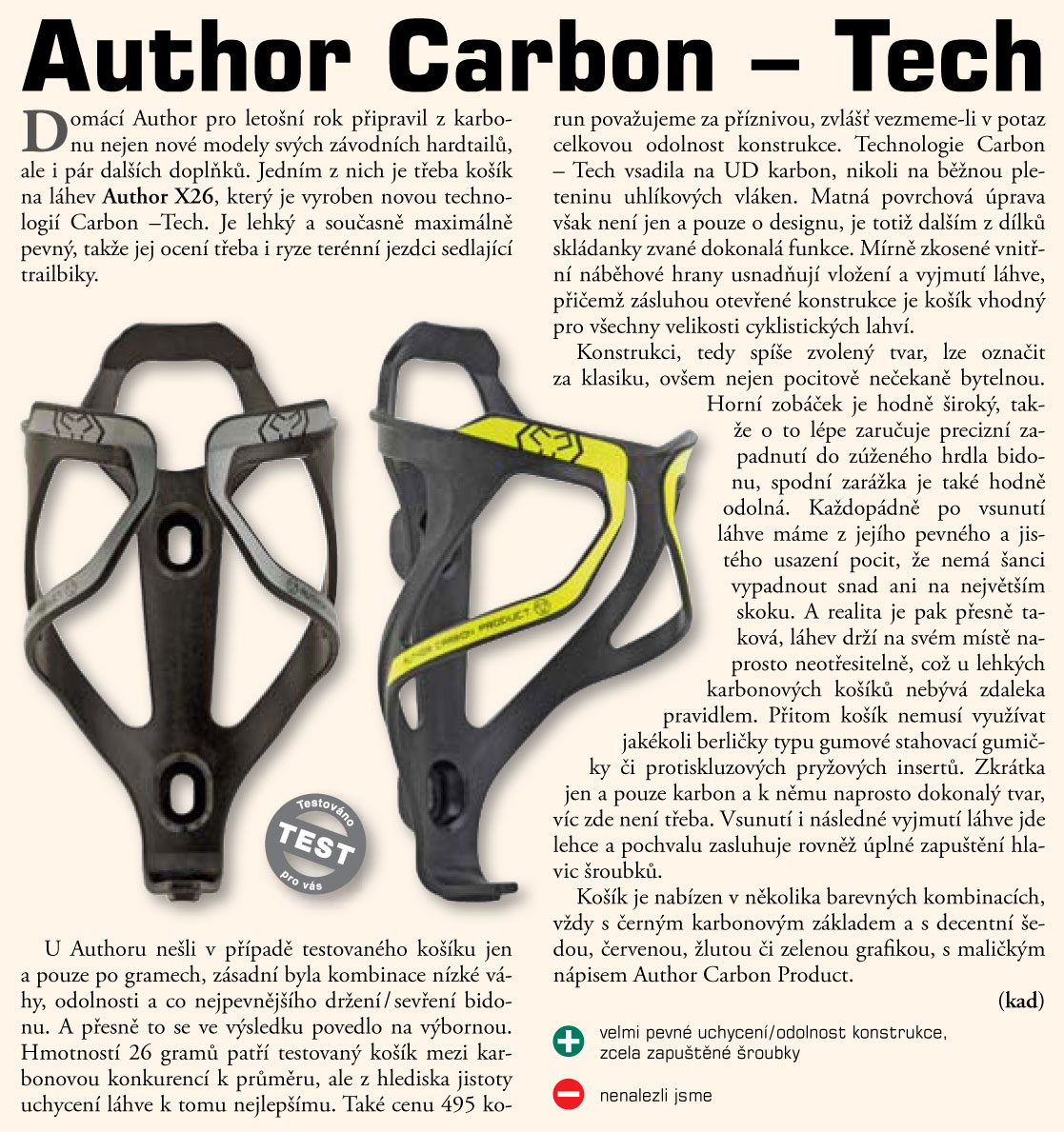 Košík na láhev AUTHOR X26 je vyroben novou Carbon –Tech technologií. Je velmi lehký a pevný. Tvarované vnitřní hrany usnadňují vložení a vyjmutí láhve. Díky otevřené konstrukci je vhodný pro všechny velikosti cyklistických lahví. Matná karbonová povrchová úprava skvěle vypadá a perfektně funguje.