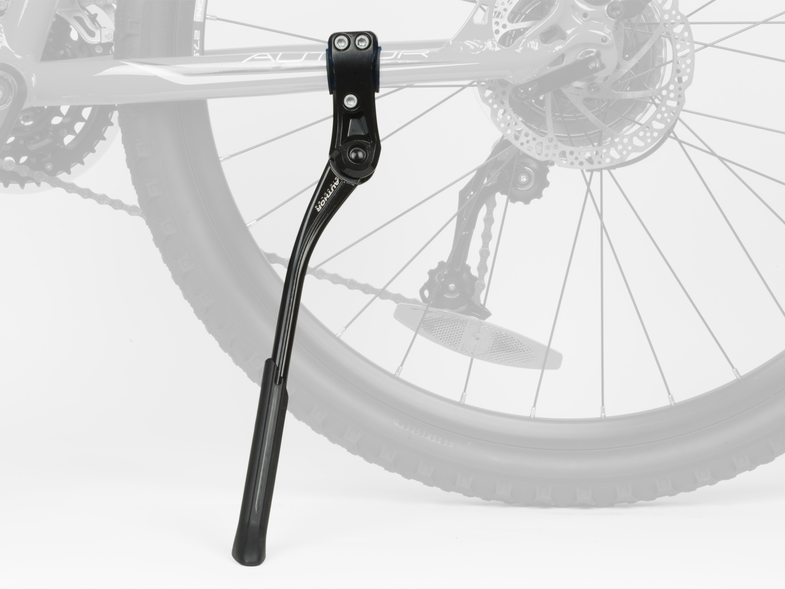 Univerzální stojánek s úchytem na spodní vzpěru zadní vidlice (výška profilu 22-25 mm), vhodný pro kola s kotoučovou zadní brzdou.