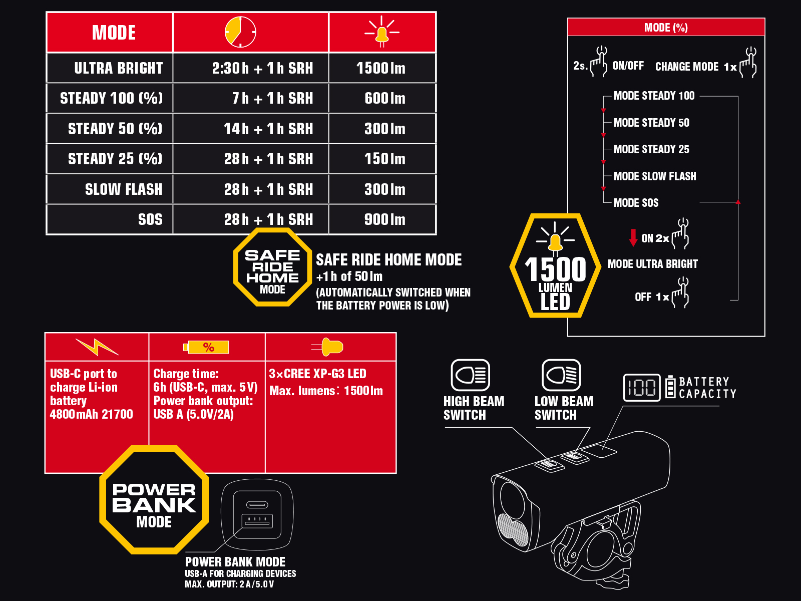 - 6 světelných režimů & vynikající stranová viditelnost.