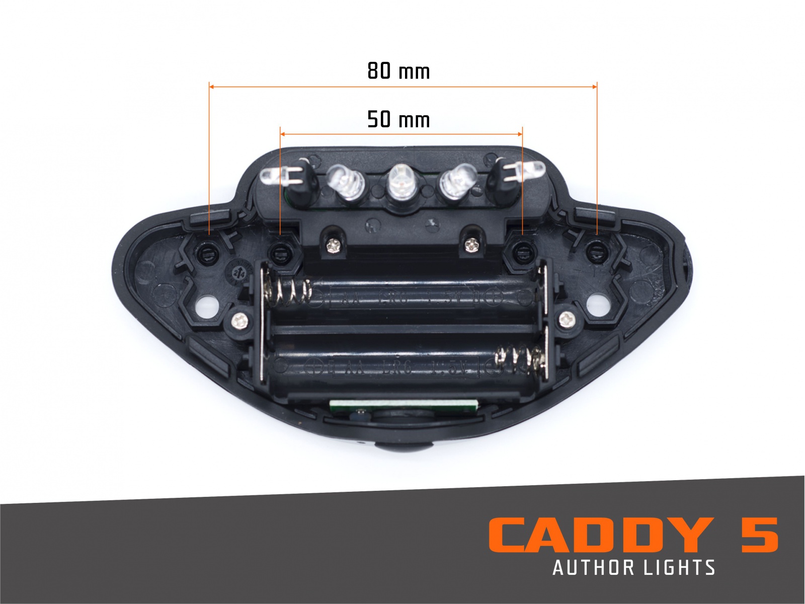Typ LED / Světelný výkon: 5 LED high brightness. Intezita svícení ve vzdálenosti 3,6m: 160cd / 3,16 m. Doba svícení: Konstantní svícení až 50 h. Režim blikání až 100 h. Baterie: 2x AA alkalické / LR06 / alkalické. Držák: 2x M5 šrouby (rozteč šroubů 50 nebo 80 mm).