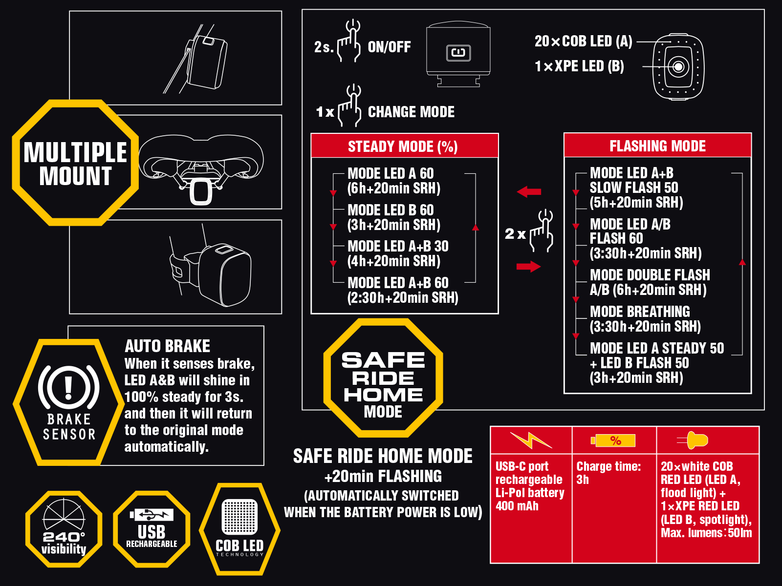 - AUTOMATIC BRAKE SENSOR – jakmile začnete brzdit, všechny LED čipy se rozsvítí na 100 % výkonu po dobu 3 s, po tomto intervalu se vrátí zpět do původního režimu.