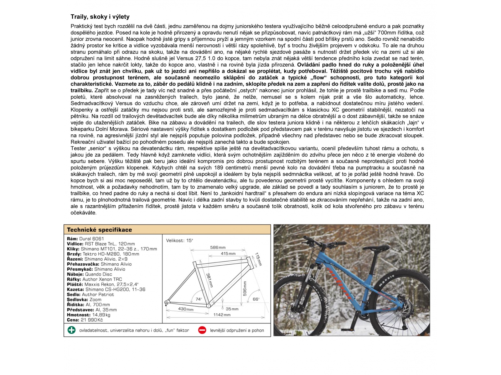 Trailové kolo se speciální hravou geometrií a odolnými komponenty. To je Author Versus 27,5 1.0, které je postaveno na bytelném duralovém rámu s velkým slopingem. Vpředu pracuje robustní olejová vidlice RST Blaze se zamykáním. Je určeno pro novou kategorii kol, tzv. downcountry, která klade důraz na terénní schopnosti především ve sjezdech, ale zvládne i šlapavé traily a nebojí se ani skoků. Představuje tak ideální volbu pro začínající jezdce, kteří jsou jako doma v bikeparcích, mají rádi technické ježdění a nemohou či nechtějí investovat do drahého celoodpruženého kola. Sjezdová trať, klopenky, zábavné traily, skoky, schody, obrubníky nebo pumptrack – zde všude se cítí Author Versus jako ryba ve vodě. Osazení kola je podřízeno dobré odolnosti a příznivé ceně. Řadí sada Shimano Alivio ve variantě 2 × 9 rychlostí, brzdí hydraulické kotoučové brzdy Tektro a terénní schopnosti výrazně zvyšují široké pláště Maxxis. Author Versus nejlépe funguje v technických pasážích, ale zvládne sloužit i jako běžné sportovně rekreační horské kolo. Proto je velmi oblíbené mezi juniory, kteří dnes už obvykle nechtějí hltat desítky kilometrů, ale chtějí se na kole bavit. Prostě zábava se vším všudy za dobrou cenu.