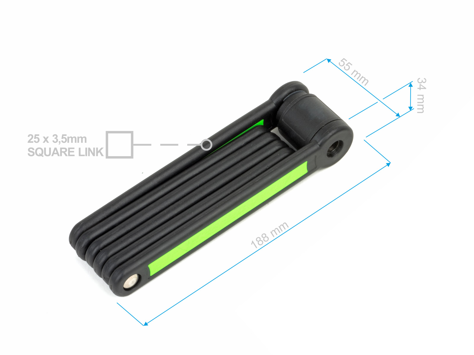 - Obvod: 840 mm, rozměr ve složeném stavu 188x55x25 mm (průměr hlavy zámku 34 mm).