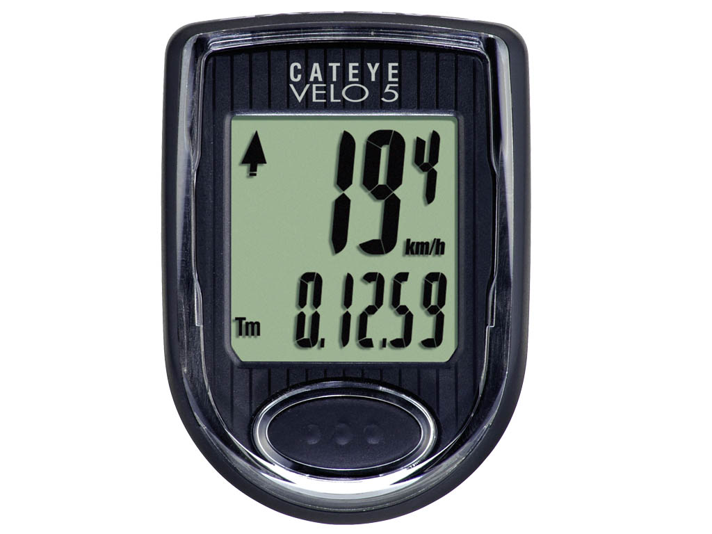 Cyklopočítač CATEYE, 5 funkcí: denní / celková vzdálenost, okamžitá / max. rychlost, hodiny, aut. funkce START / STOP.